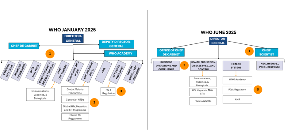 Since May, WHO has initiated a far-reaching reorganization of its leadership and program structure in response to budget shortfalls, consolidating ten offices into four broader divisions. The goal, according to WHO leadership, was to simplify reporting lines, reduce duplication, and group related programs under larger umbrellas. In this reshuffle, some of the agency’s R&D-focused programs were impacted by these structural changes, including: